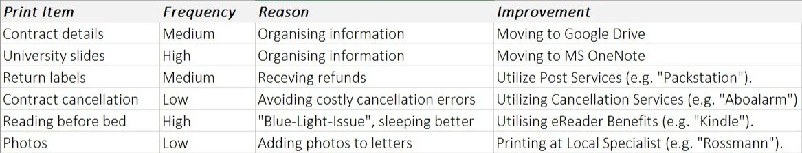 Giving you the table above, I already showed you what I usually print for. Analysing the reasons, I could find patterns. Many of the use-cases and true underlying reasons will vanish in the future anyway. I printed contract details to save the contract in my personal archive. Possibly, there might not even be an option to print in the future because that could mean someone could alter a document after the fact without a digital signature of some sort. Who knows.